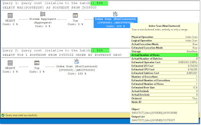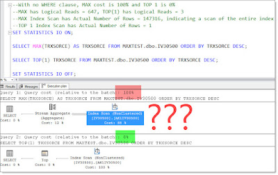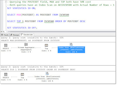 When querying some fields, such as the IV30500 POSTEDDT, with no WHERE clause, both MAX and TOP 1 perform virtually the same, with both using a very efficient Index Scan. 50% vs 50% relative costs.