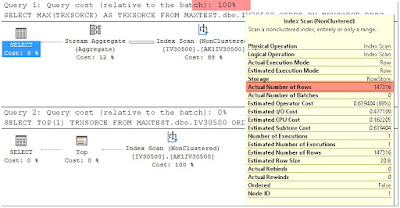But when I query the TRXSOURCE field, with no WHERE clause, MAX shows 100% relative cost, whereas TOP 1 shows 0% relative cost.