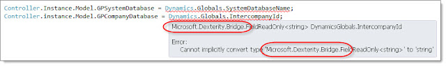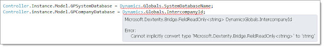 Once I added the Bridge reference, Intellisense stopped complaining about the type conversion, and I was able to get Intellisense values for SystemDatabaseName and IntercompanyId.