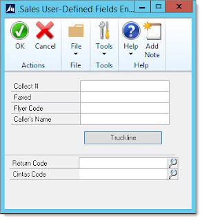 They have a modified SOP Transaction Entry window and a modified SOP User Defined Fields Entry window. The SOP Trx Entry window has two custom buttons and a little bit of VBA script, while the SOP UDF window has some fields hidden to simplify it, along with a custom button that opens a custom VBA window.